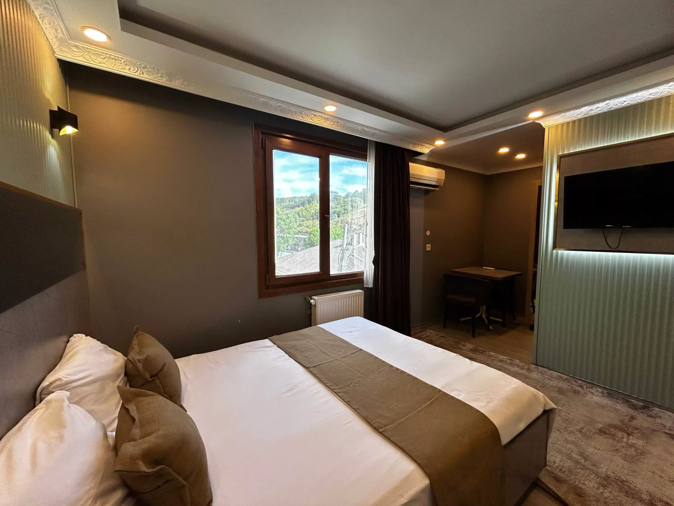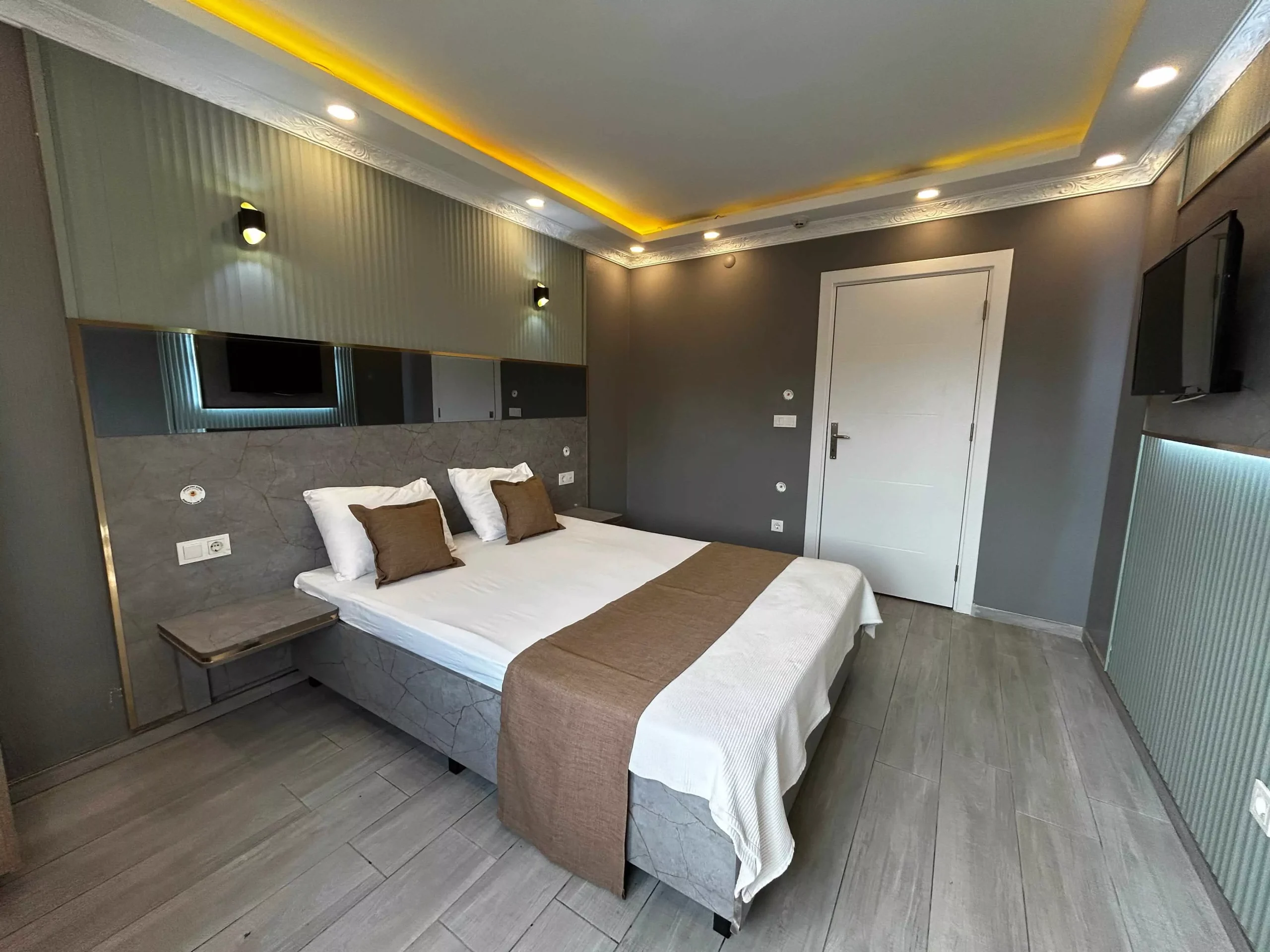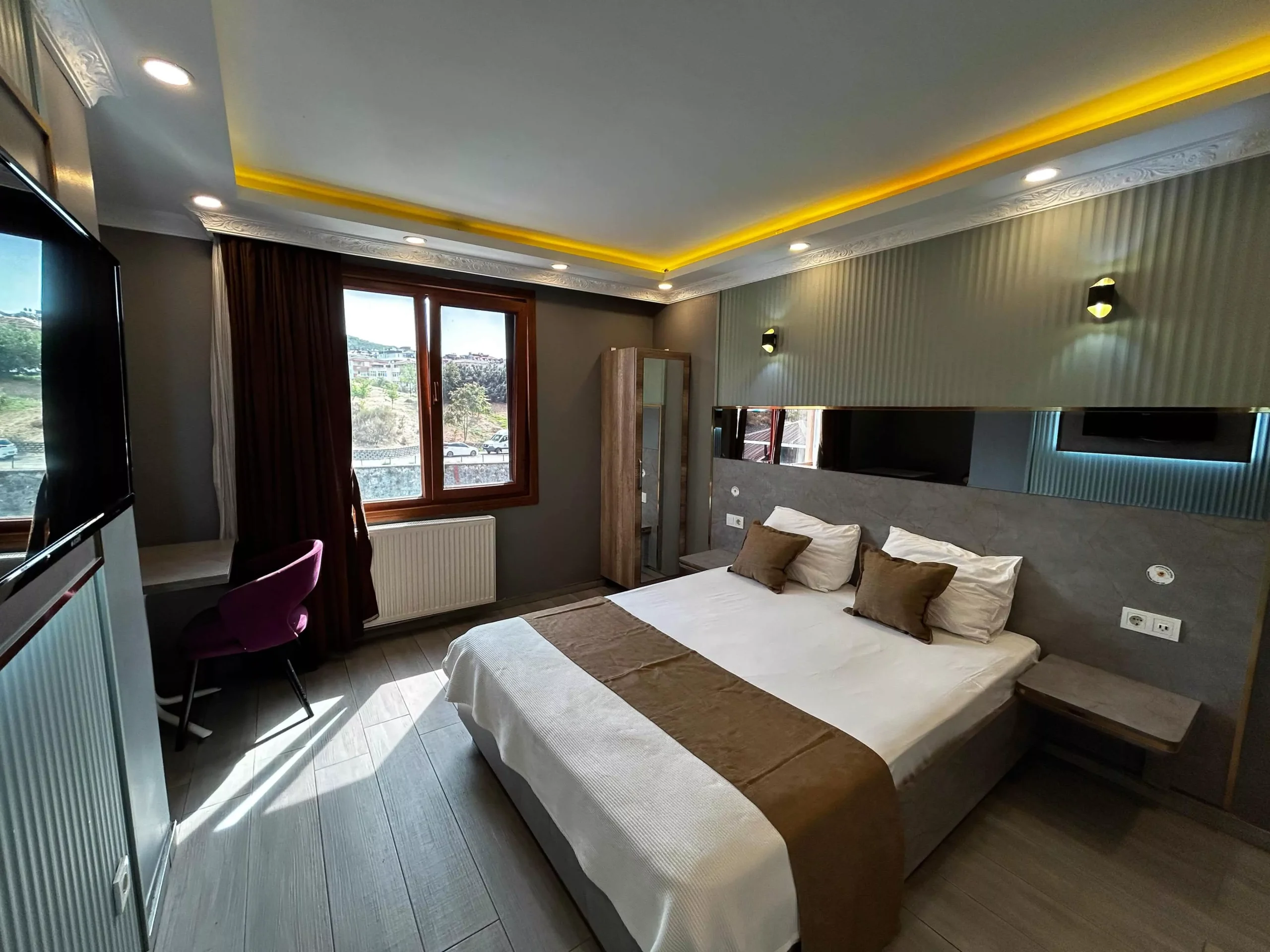 Odamızda ücretsiz Wi-Fi, klima, Smart TV, 7/24 sıcak su ve geniş yataklar bulunmaktadır. Günlük temizlenen hijyenik ortamı ile güvenli ve rahat bir konaklama sağlar. Ücretsiz otopark imkanı sayesinde araçlı misafirlerimiz için büyük avantaj sunmaktadır.